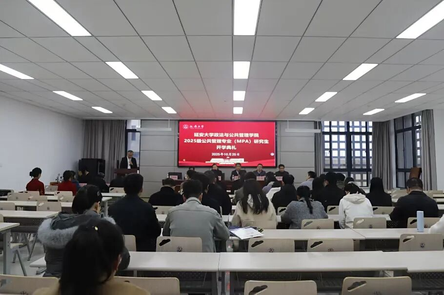 本网讯 10月25日上午,延安大学政管学院2025级公共管理专业(MPA)研究生开学典礼在学院A栋212报告厅隆重举行。院党委书记崔林立、院长常改香,院党委副书记李利锋,副院长王峰、张继军、肖龙,公共管理中心秘书侯宝柱、班主任徐艺方及2025级公共管理专业研究生参会,典礼由学院党委副书记李利锋主持。